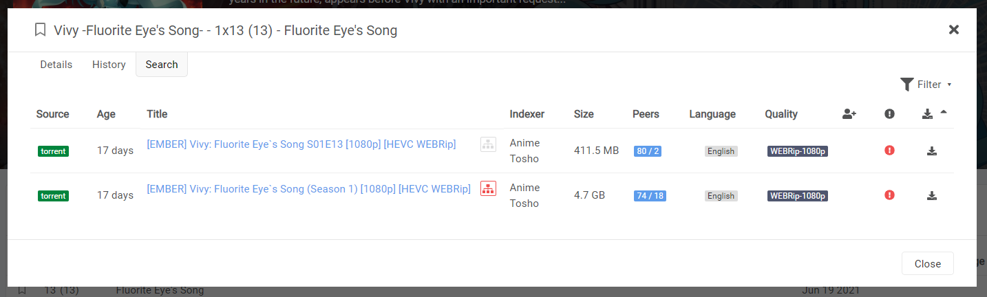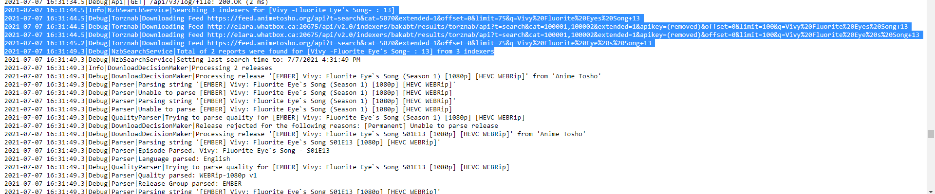 Logs show that it searches for “Vivy Fluorite Eyes Song 13” first with 0 results and then “Vivy Fluorite Eye s Song 13” next with 2 results and disregards the last alternative title “Vivy - Fluorite Eye’s Song”