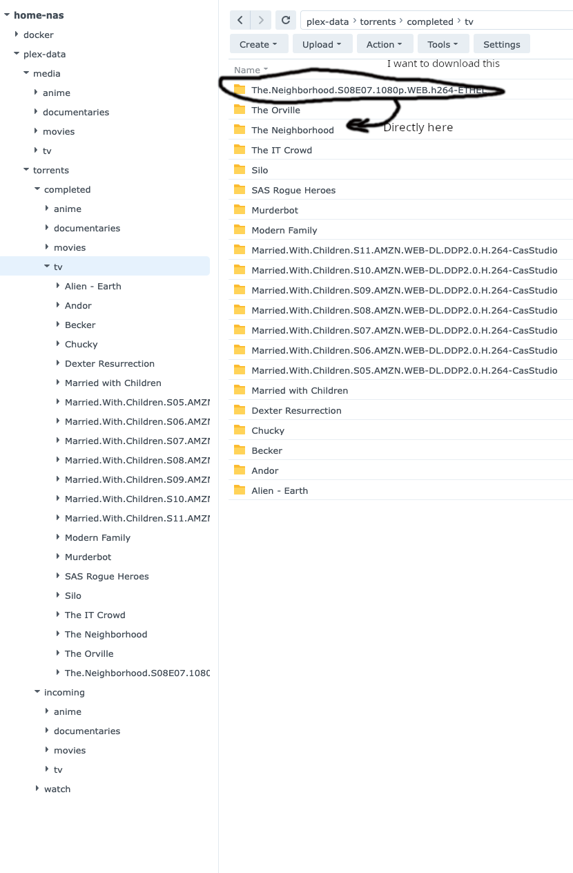 I already have Sonarr and qBittorrent configured, and they work well. This is the folder structure I use, and how I would like to make the downloadd client work automatically. The config is the following: Sonarr adds a show/season/episode/etc to qbittorrent, which downloads the files in plex-data/torrents/incoming. When the torrent finishes, it is moved in plex-data/torrents/completed/..., at which point Sonarr makes a hard link into plex-data/media/..., which is where plex scans its libraries. I have one instance of qbittorrent running, with 3 separate configs for it in sonarr, which download automatically in either tv, documentaries, or anime, depending on which tag I set when I add the shows. However, the download client downloads directly in those folders, and I want to organize them further based on show and season. At the moment I manually set the save path in qbittorrent after the torrents are added, but this is getting tiresome. Is there any way to achieve this automatically, either directly from Sonarr or with the help of some plugin/addon/script/etc.?