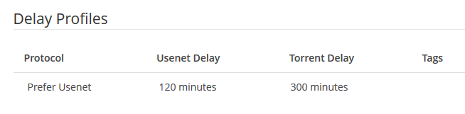 Since I’m missing a couple of old episodes for different TV series in my collection and Usenet doesn’t really have them now I decided to adding torrents into the mix. Delay profiles are new to me and based on only basing my understanding off of the articles I read about it.