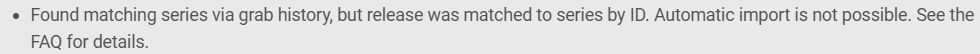 however it wasnt directly linked to the forums via sonarr. Just given a toast to refer to FAQ, ive had this error many times and just work around it but i figured it was time to actually figure out what it meant. so i googled “Sonarr FAQ” and ended up here. ive since found the actual FAQ from the discord server. (that one does not appear on a google search) but i figured it would be worth pointing out that the FAQ here is a bit mistagged here. in case someone is looking for it.
