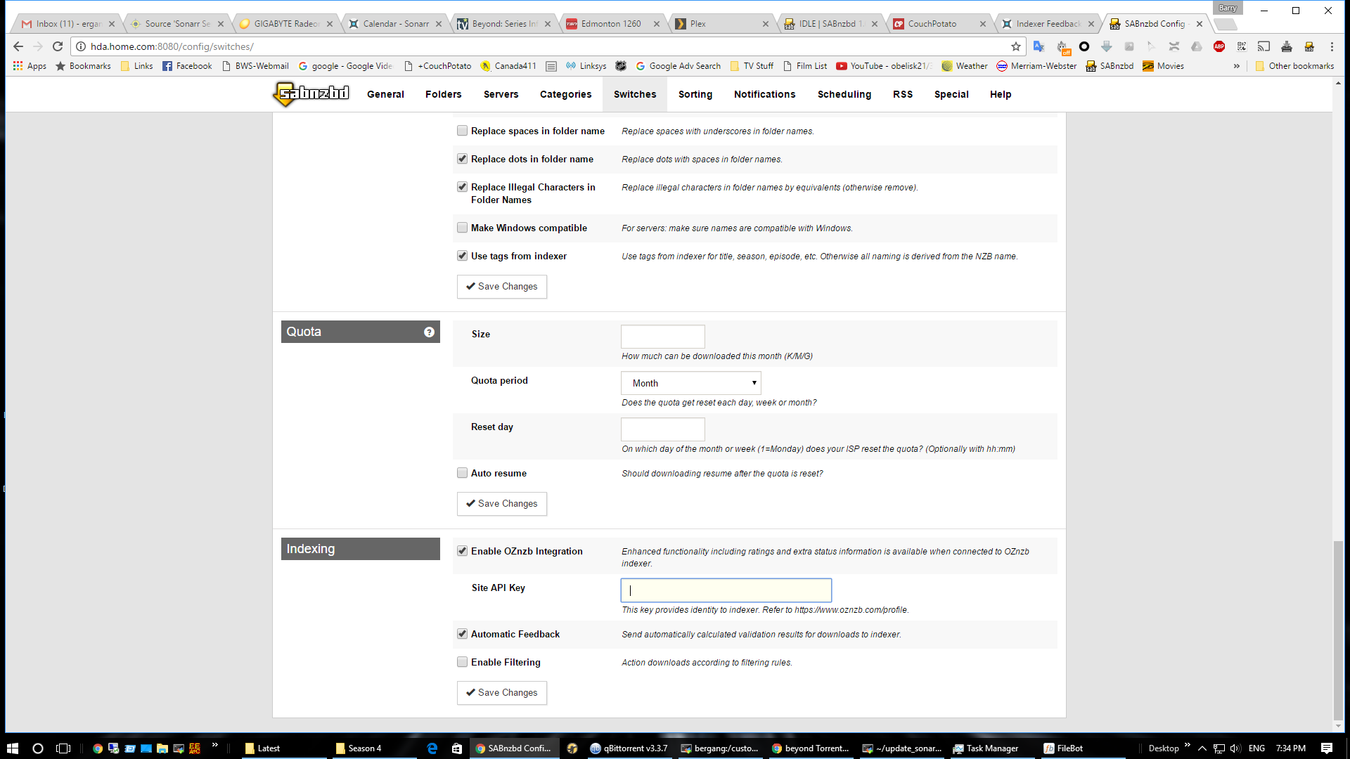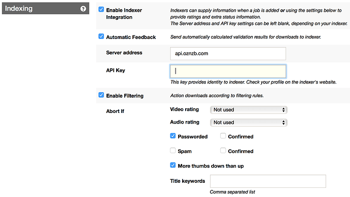 If you are using SABnzbd you can see in the image below the configuration section called “Indexing” which has the OZnzbd integration.