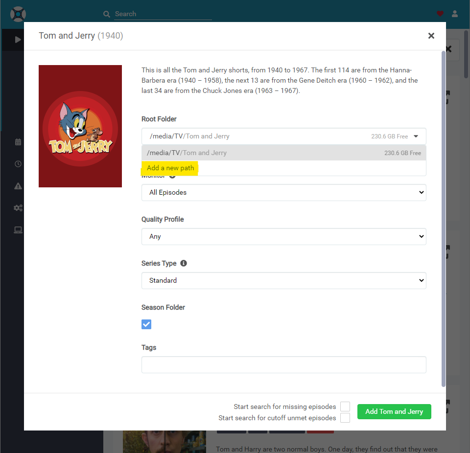 Sonarr > Series > Add New > search ‘Tom and Jerry’> click ‘Tom and Jerry (1940)’ > Root Folder > click drop down menu > Add a new Path > add /home/plex/media/TV-Shows/ > OK > Add Tom and Jerry