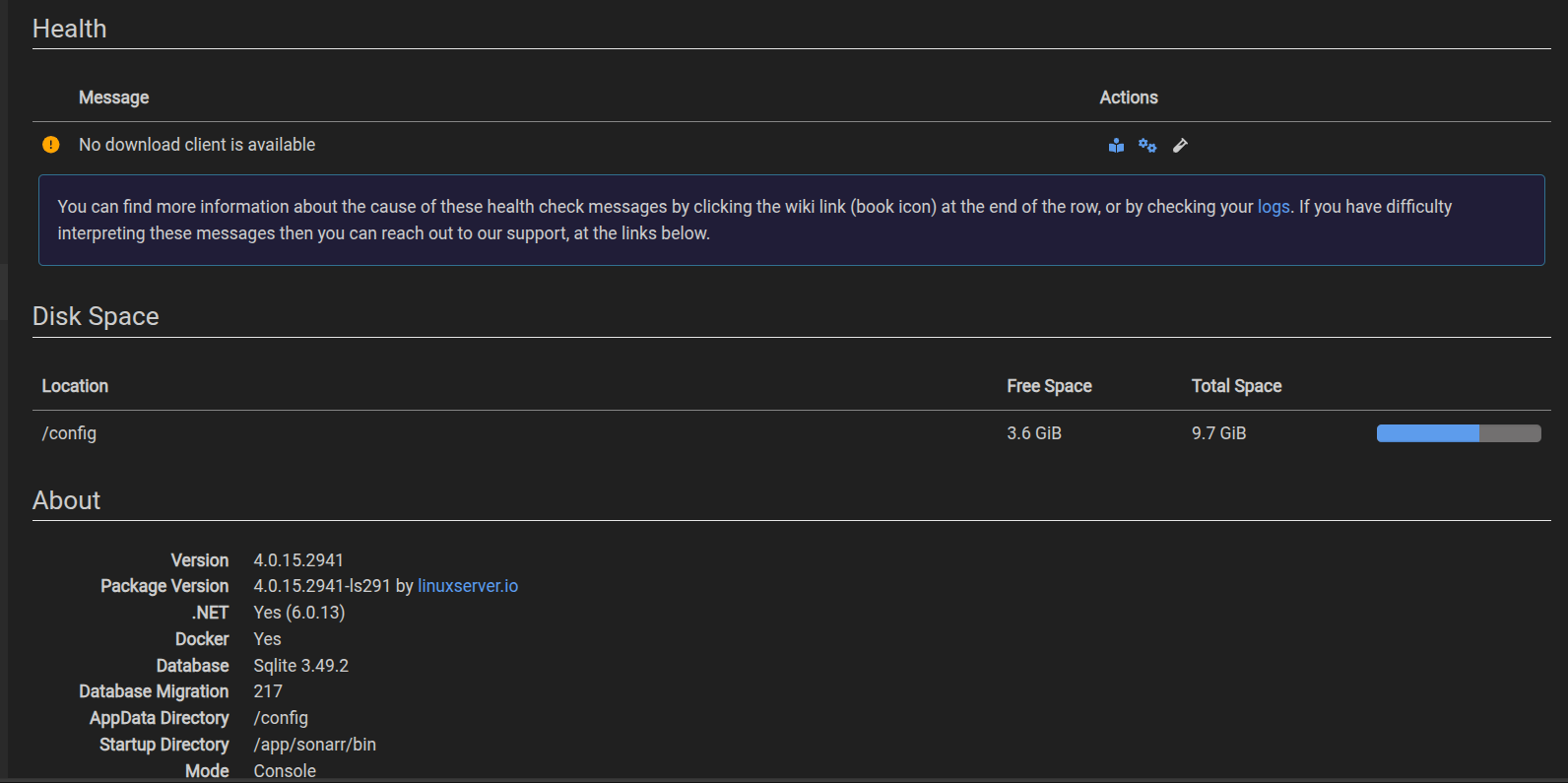 But on the status page, I am unable to see the Disk Space. I only see the config.