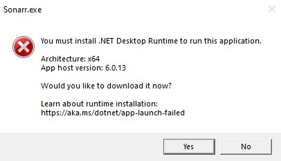 Immediately after the vers upgrade, upon reboot Sonarr fails to start and error prompt appears: ‘You must install .Net Desktop Runtime to run this app.’