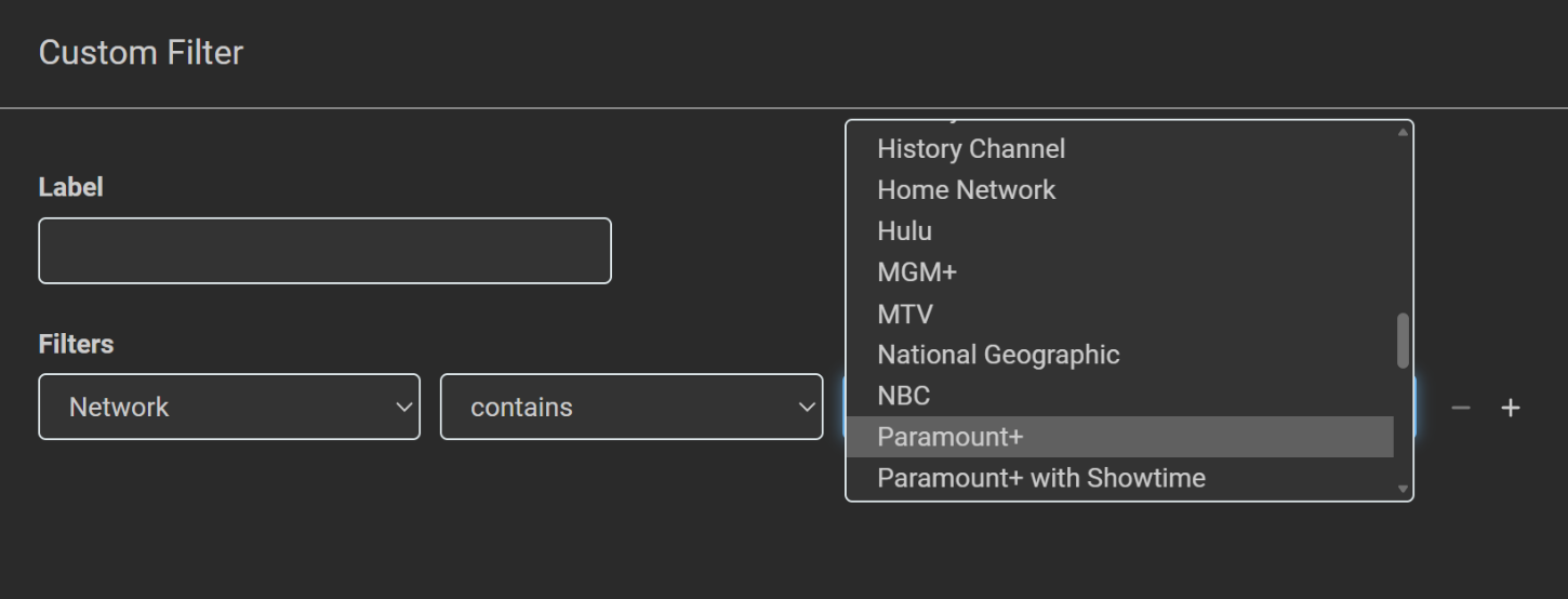 Description of issue: Would like to filter all shows from Netflix, however Netflix is not in the list of Networks under “Network” tag in “Custom Filters”. Can Netflix be added by devs or manually by me?
