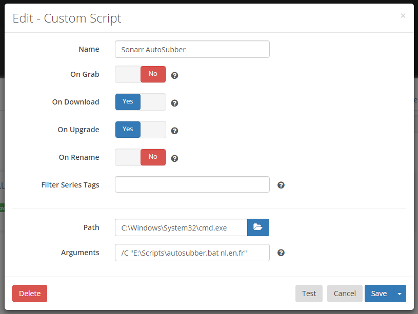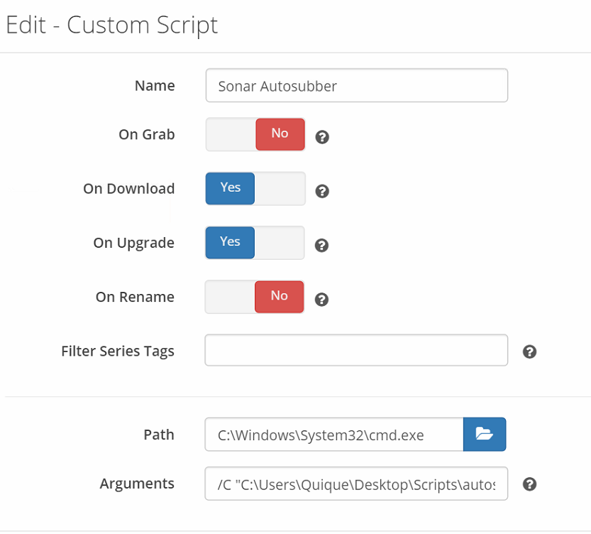 - Setup the custom script in Sonarr (Sonarr → Settings → Connect → + → Custom Script)