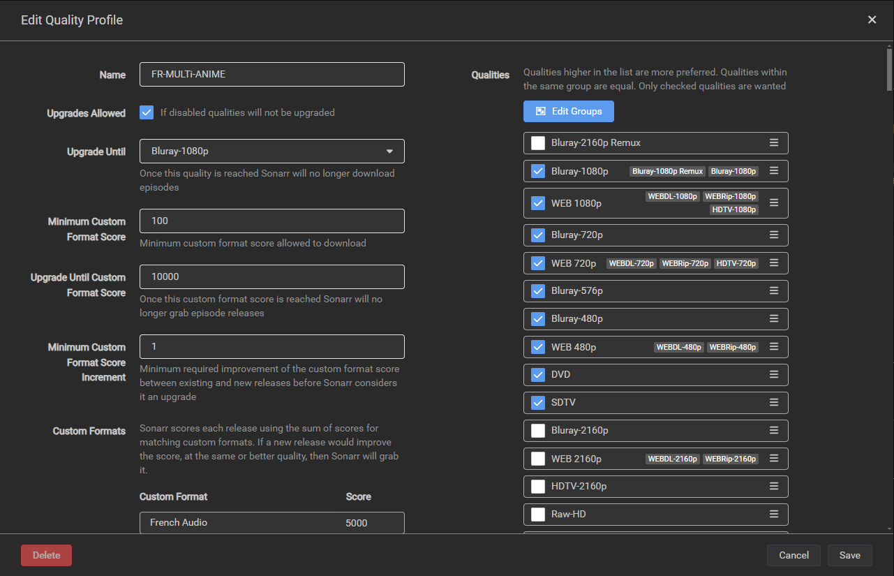 Hi, I’m having trouble understanding how the series updates work. For example, I have one series configured with CF, and the “Propers and Repacks” option is set to “Do Not Prefer.” However, my series never updates automatically. I have to manually check when a new release is available, then start a search for it to find and download the correct episode (French version).