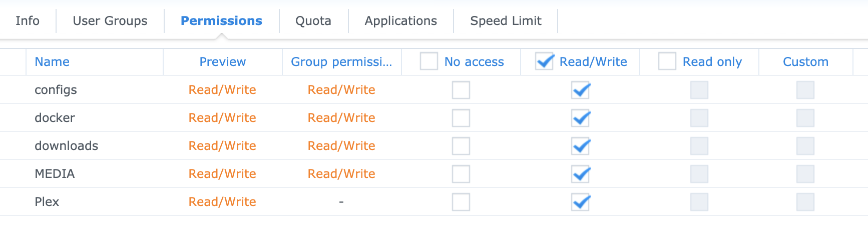 But then when I download a new file and it lands in downloads, the permissions seem to automatically revert to ‘custom’ (all ticked except ‘Administration’ and ‘delete’)