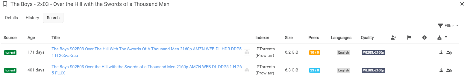 My second question, and the question that actually drove me to post this, is that when it was downloading individual episodes, it returned the first torrent on this list, even though the second torrent was the same quality and had more seeders. This should also be reflected in the first pass debug log. This is what the torrent selection looks like for this episode (S02E03):