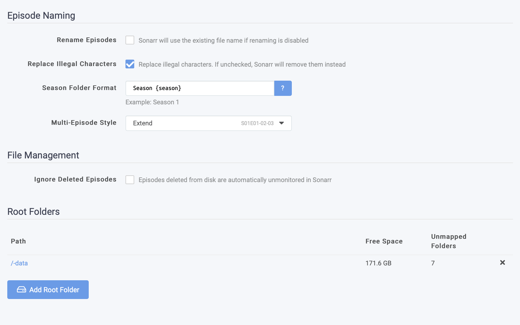 Sonar > Settings > Media Management > Root Folders. This only allows to select from a specific predefined group… and /-data is the only item that seems close to anything usable. That is what is selected here.