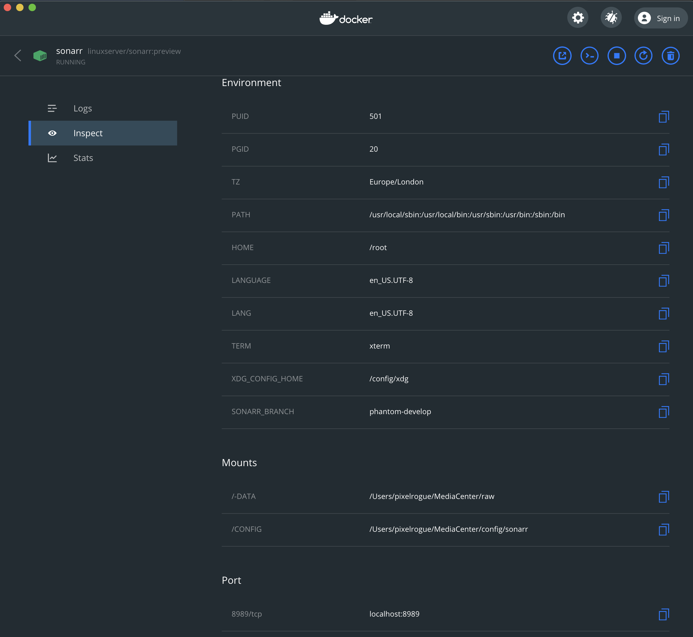 Docker > Sonarr > Inspect