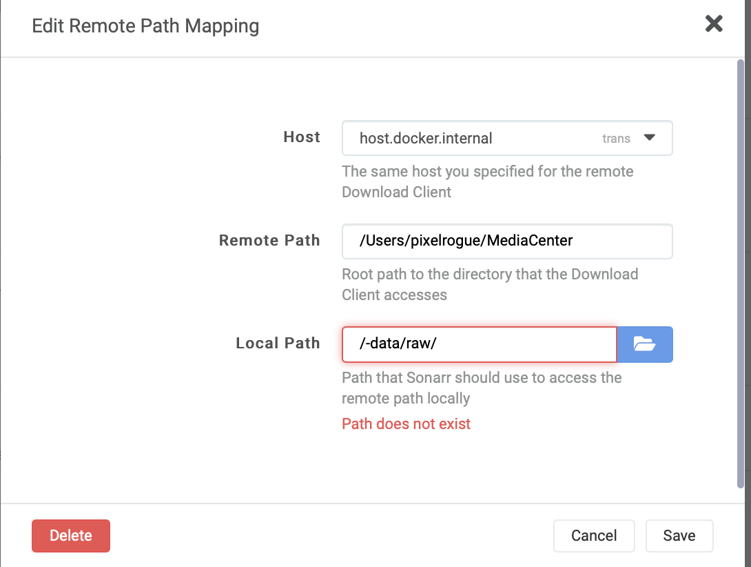 Sonarr can see the transmission files. Sonarr appears to when when the file has been completed, knows to go process the file and then hits that error. That is how it seems to me. Is there a way to determine what the proper path inside the container is, or should be to fix?