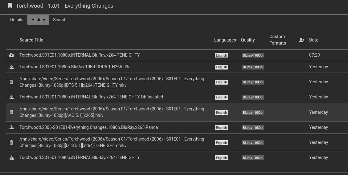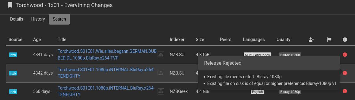 go back to that torchwood episode and its search tab, click on interactive search and manually grab any (nzb) download that is the same quality as the last one you have.